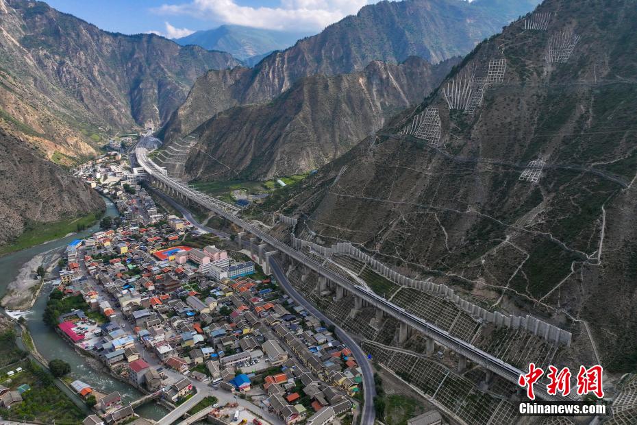 圖為川青鐵路鎮(zhèn)江關(guān)至黃勝關(guān)段松潘站全景。(無人機照片)中新社記者 劉忠俊 攝