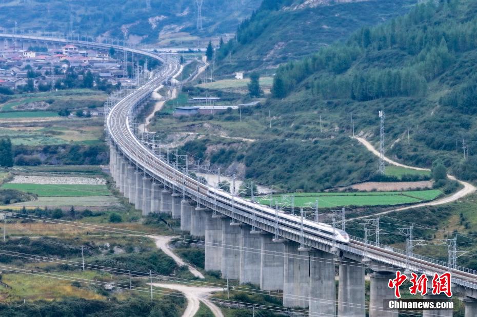 圖為一列CRH2G型高寒動車組運行在川青鐵路黃龍九寨站至松潘站區(qū)間高架橋段。(無人機照片)中新社記者 劉忠俊 攝