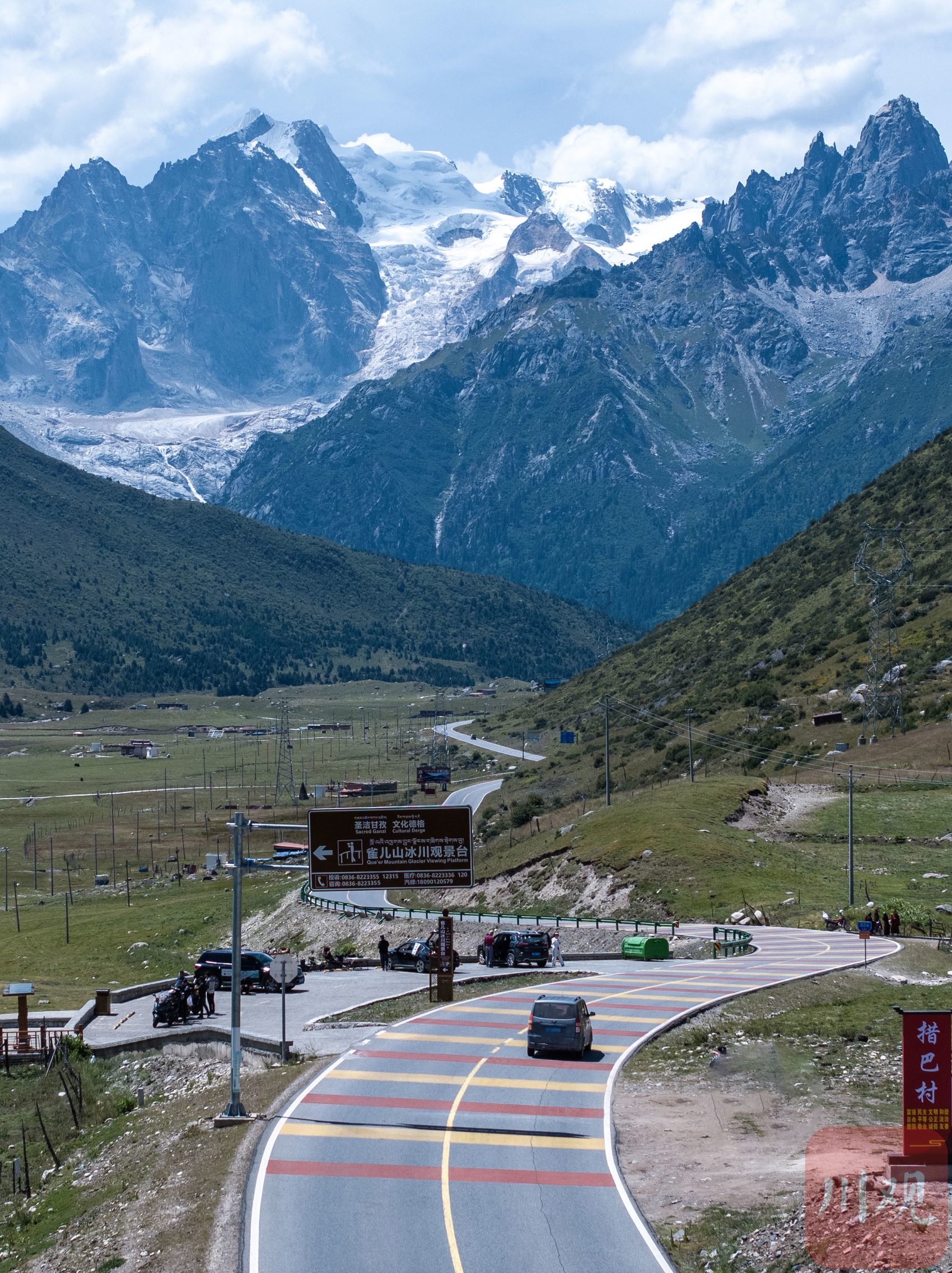 國道317線上遠(yuǎn)眺雀兒山冰川。