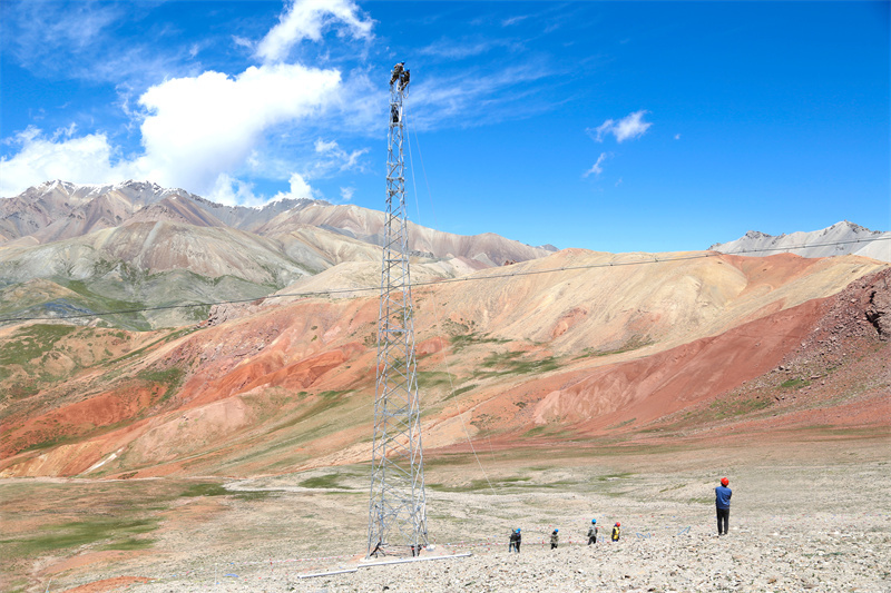 團(tuán)結(jié)峰下,國(guó)網(wǎng)青海省電力公司輸電專業(yè)施工人員正在開展蘇里35千伏輸變電工程組塔安裝工作。許小萍 攝