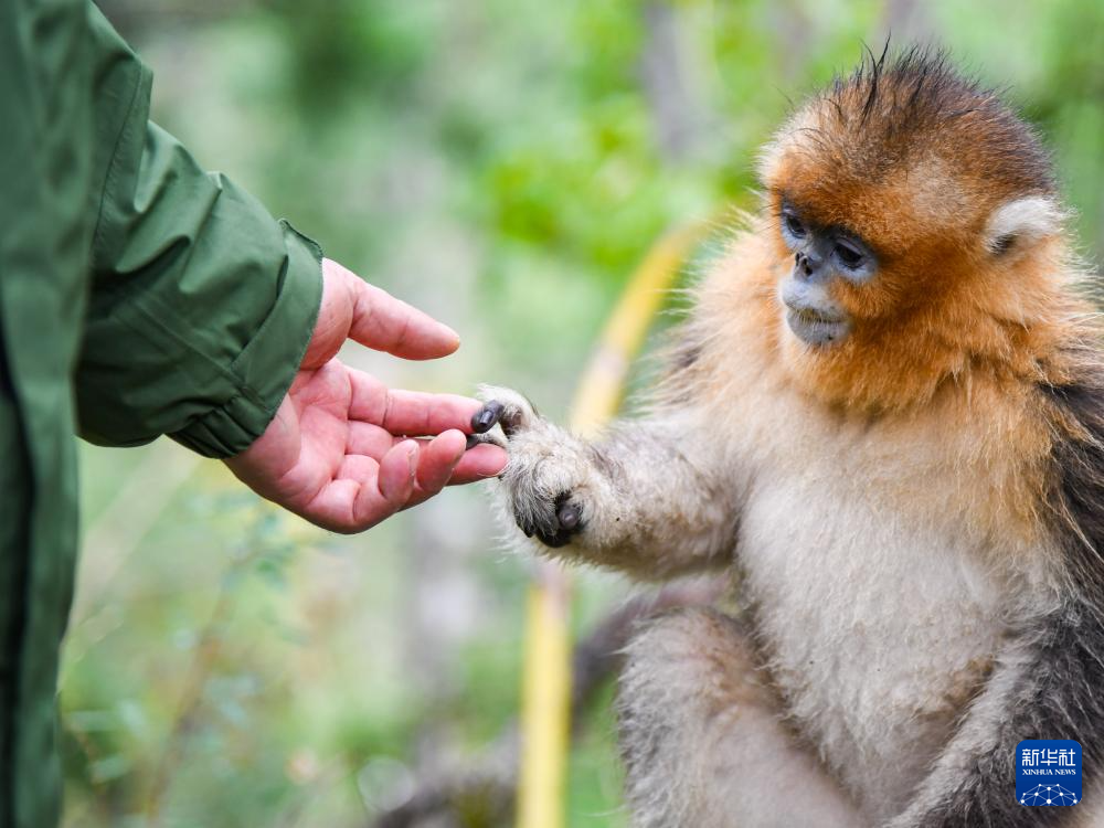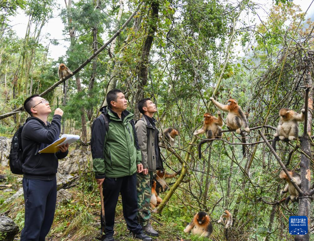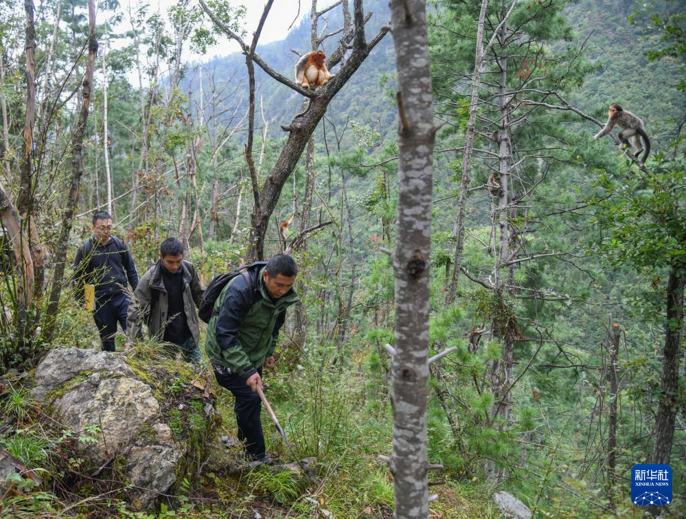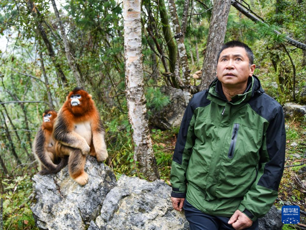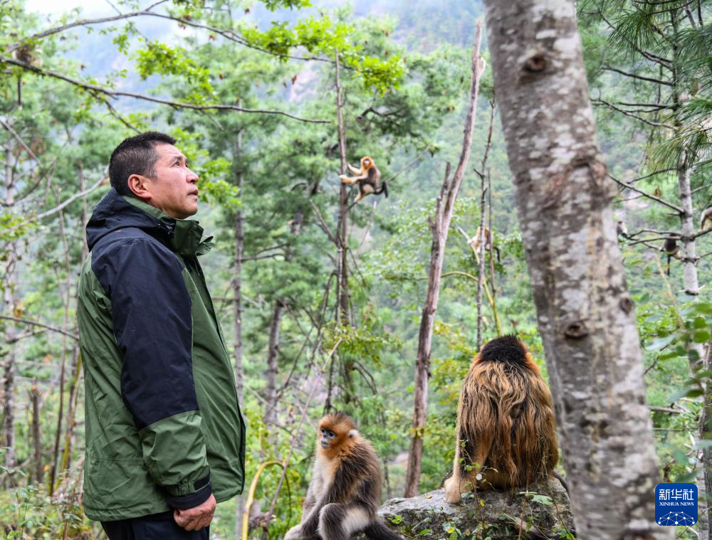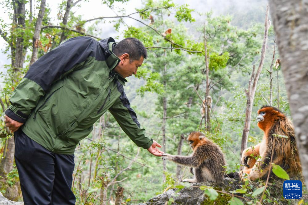 在四川白河國家級自然保護(hù)區(qū),唐玉林和川金絲猴互動(10月11日攝)。新華社記者 王曦 攝