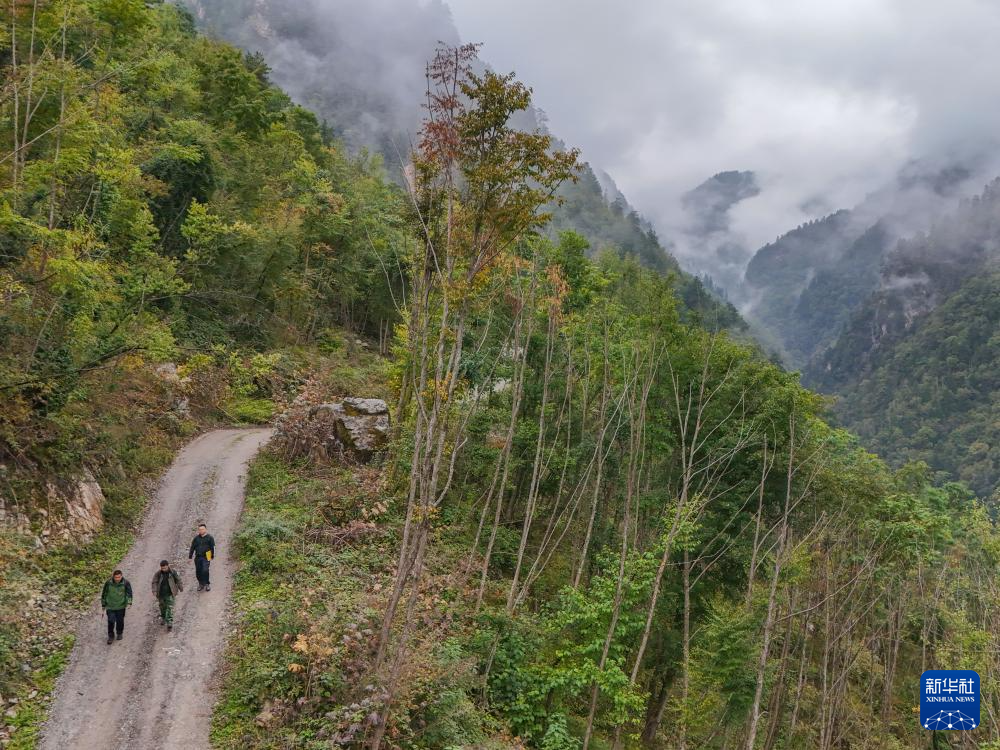 在四川白河國家級自然保護(hù)區(qū),唐玉林(左)、侄子唐小剛(中)和西華師范大學(xué)生物學(xué)研究生劉昕走在巡護(hù)的路上(10月11日攝)。新華社記者 王曦 攝