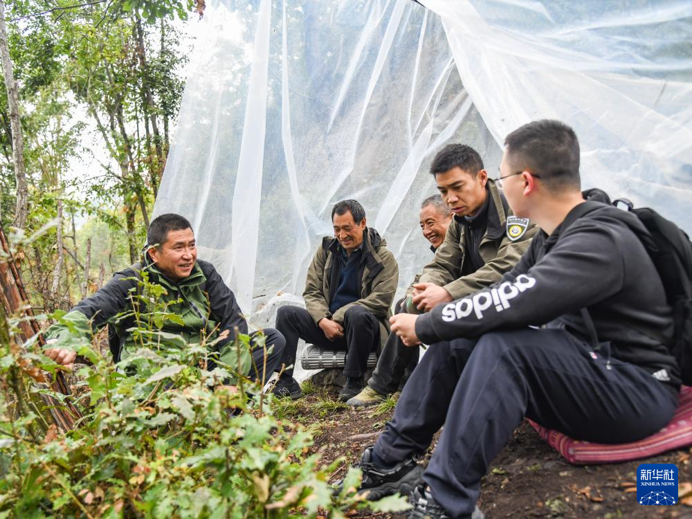在四川白河國家級自然保護(hù)區(qū),唐玉林(左一)和巡護(hù)隊(duì)員一起在搭建的簡易塑料蓬內(nèi)短暫休息交流(10月11日攝)。新華社記者 王曦 攝