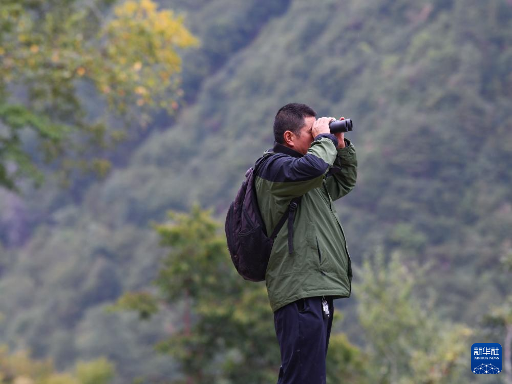 在四川白河國家級自然保護(hù)區(qū),唐玉林在觀察川金絲猴活動(10月11日攝)。新華社記者 王曦 攝