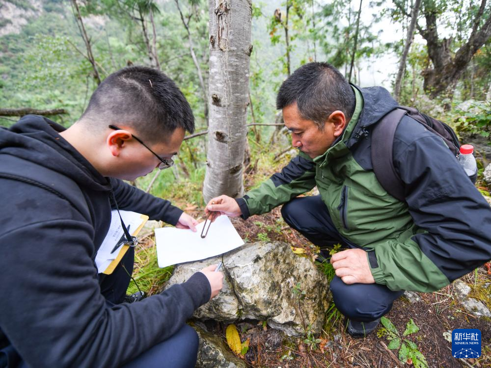 在四川白河國家級自然保護(hù)區(qū),唐玉林(右)和西華師范大學(xué)生物學(xué)研究生劉昕在收集記錄川金絲猴的糞便(10月11日攝)。新華社記者 王曦 攝