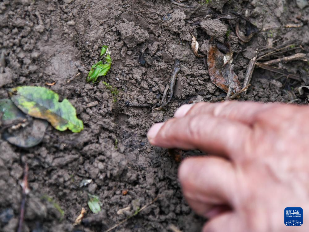 在四川白河國家級自然保護(hù)區(qū),唐玉林在巡護(hù)路上發(fā)現(xiàn)毛冠鹿的腳?。?0月11日攝)。新華社記者 王曦 攝