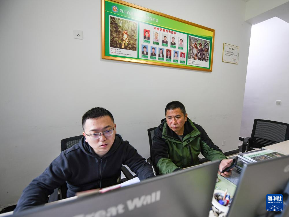 在四川白河國家級自然保護(hù)區(qū),唐玉林和西華師范大學(xué)生物學(xué)研究生劉昕在辦公室將巡護(hù)記錄的資料錄入電腦系統(tǒng)(10月11日攝)。新華社記者 王曦 攝