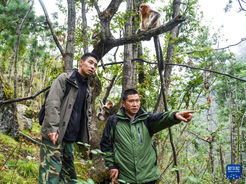 在四川白河國家級自然保護(hù)區(qū),唐玉林(右)向侄子唐小剛介紹川金絲猴的生活習(xí)性(10月11日攝)。新華社記者 王曦 攝