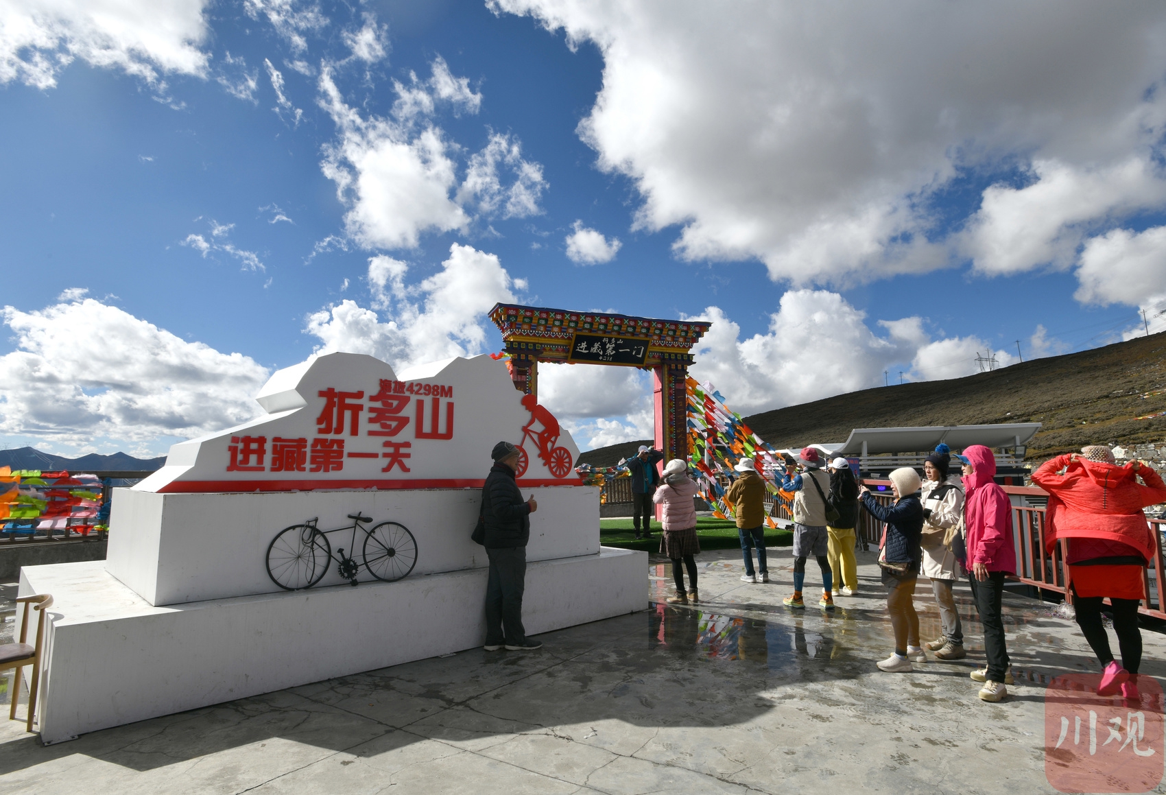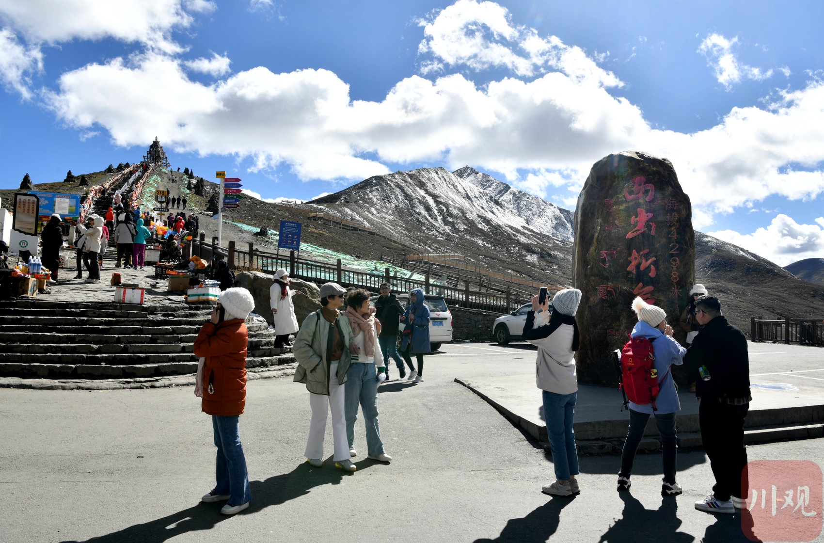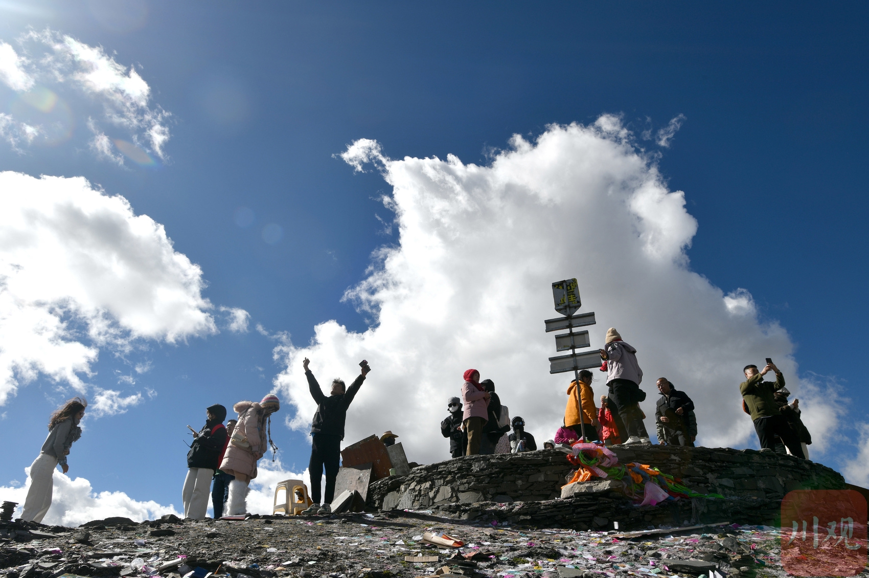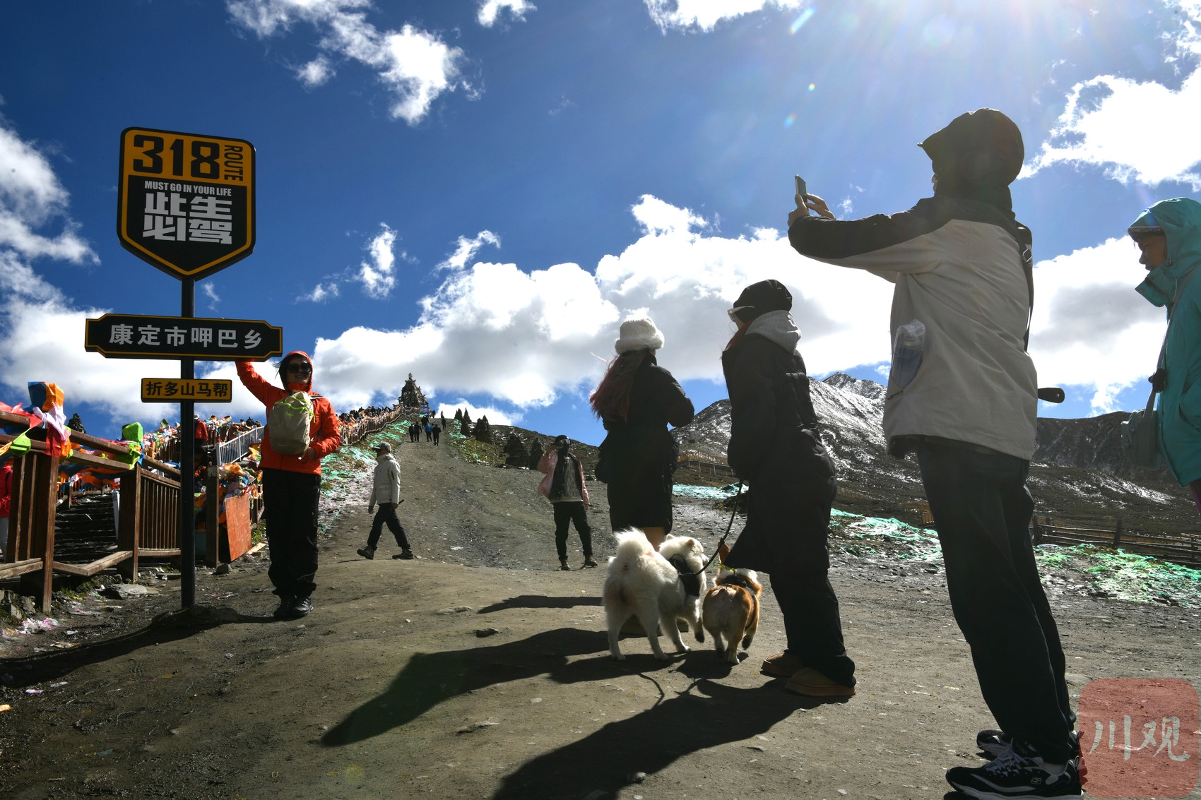 10月17日,四川在線記者在折多山埡口看到,操著各地口音的旅行者沿著上山步道觀景打卡,初入高原看到的壯美景色打消了他們旅途的疲憊。