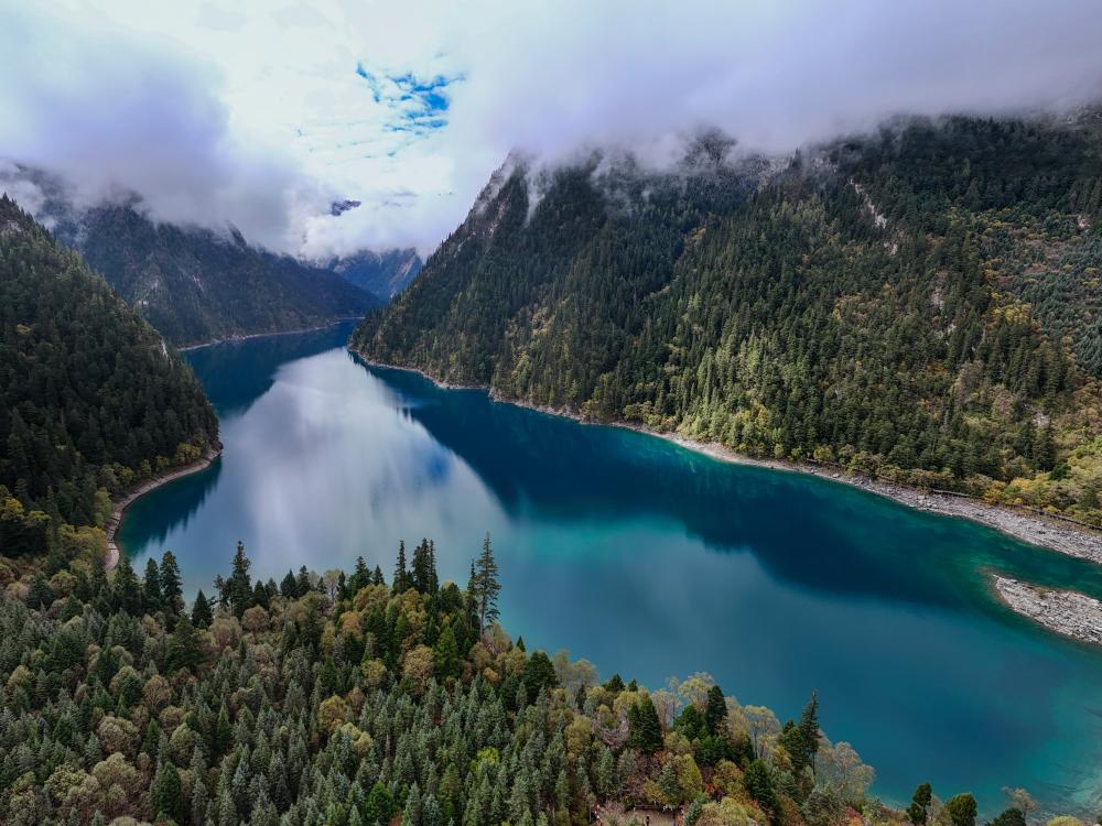從高空中俯瞰,樹正溝、日則溝和則查洼溝3條主溝呈不規(guī)則的“Y”字形躺臥于九寨溝起伏的峰巒之間。數以萬計的游客散落在綿延40多公里的狹長溝谷內,卻并不顯得擁擠。