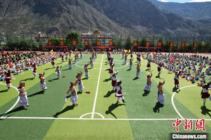 10月14日,德欽縣第二小學(xué)學(xué)生在足球場上跳集體鍋莊舞?!?德欽縣第二小學(xué)供圖)