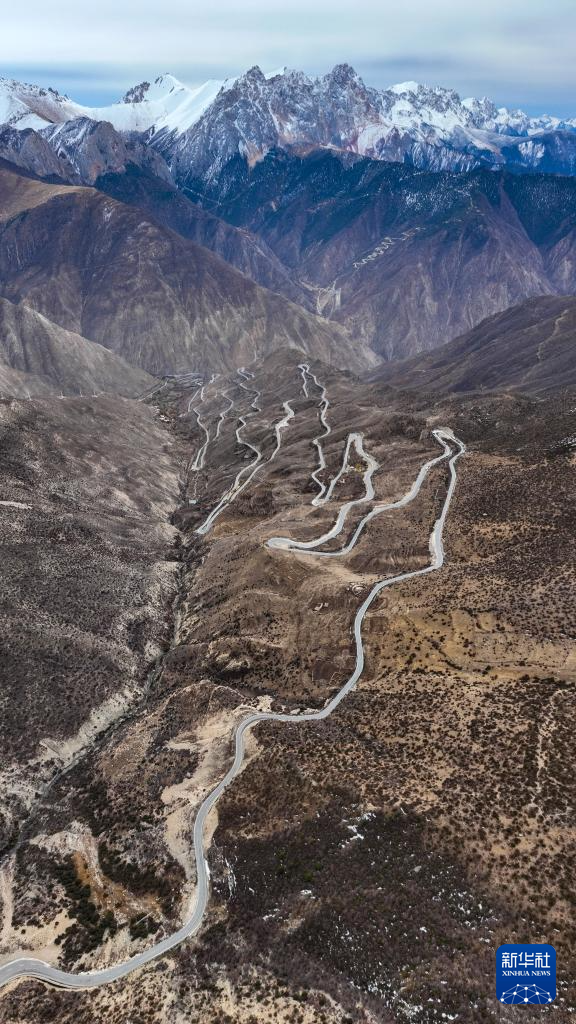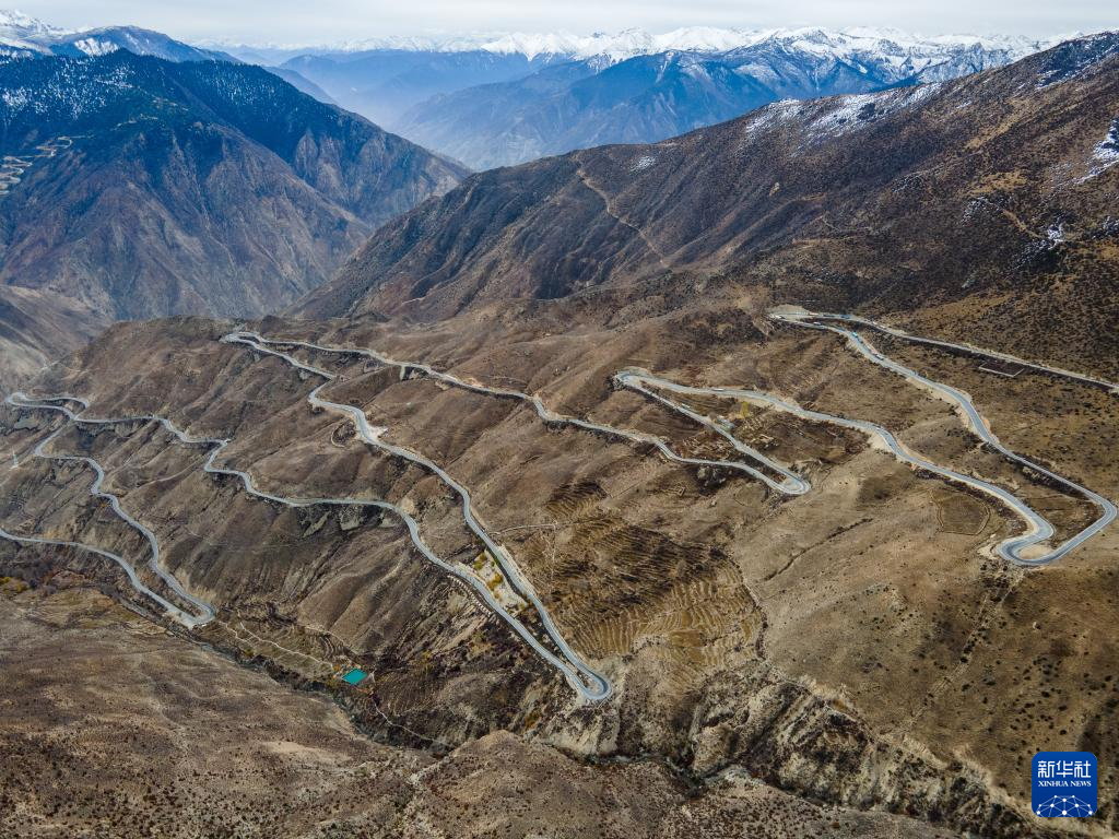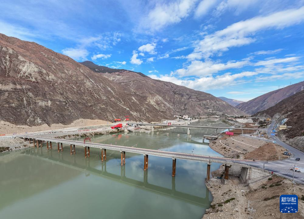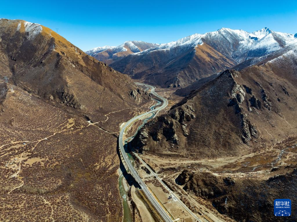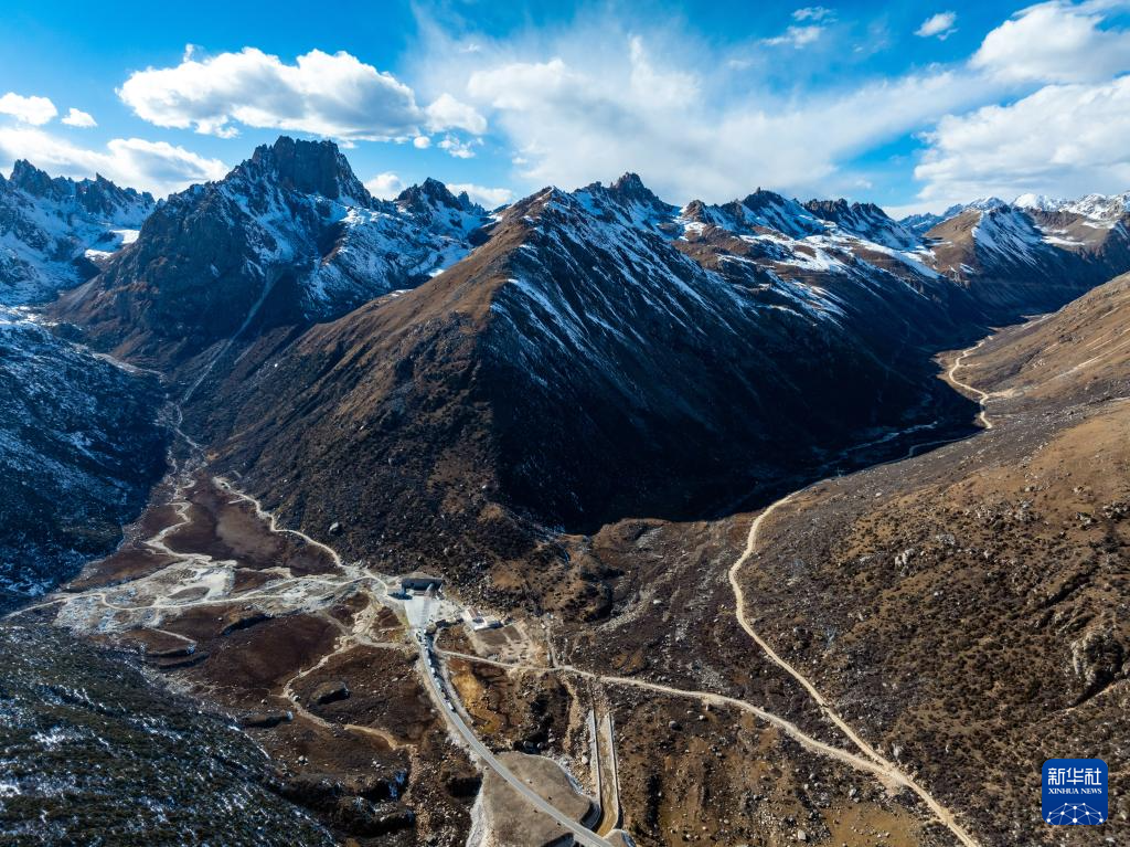 連接四川和西藏的國道317公路崗?fù)写髽蚶蠘?,遠處是新修的崗?fù)写髽颍?1月2日攝,無人機照片)。新華社記者 王曦 攝