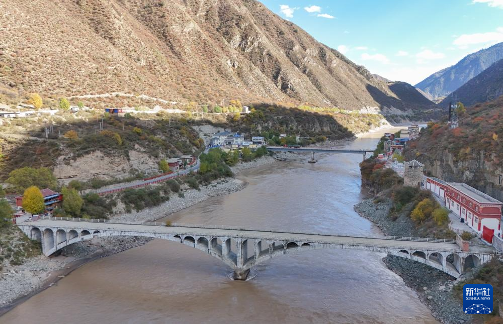 在四川省甘孜藏族自治州巴塘縣竹巴龍鄉(xiāng)拍攝的國道318公路連接四川和西藏的金沙江大橋老橋(近)和新橋(11月6日攝,無人機照片)。新華社記者 王曦 攝