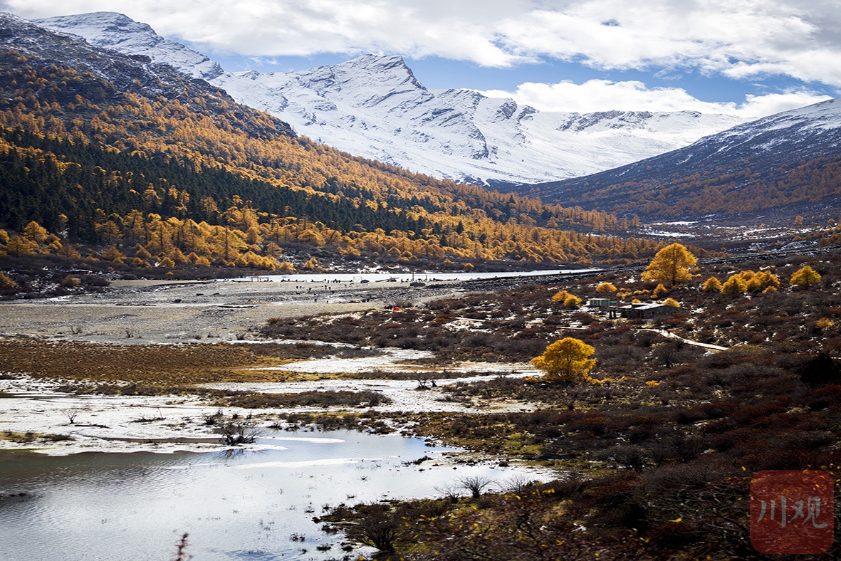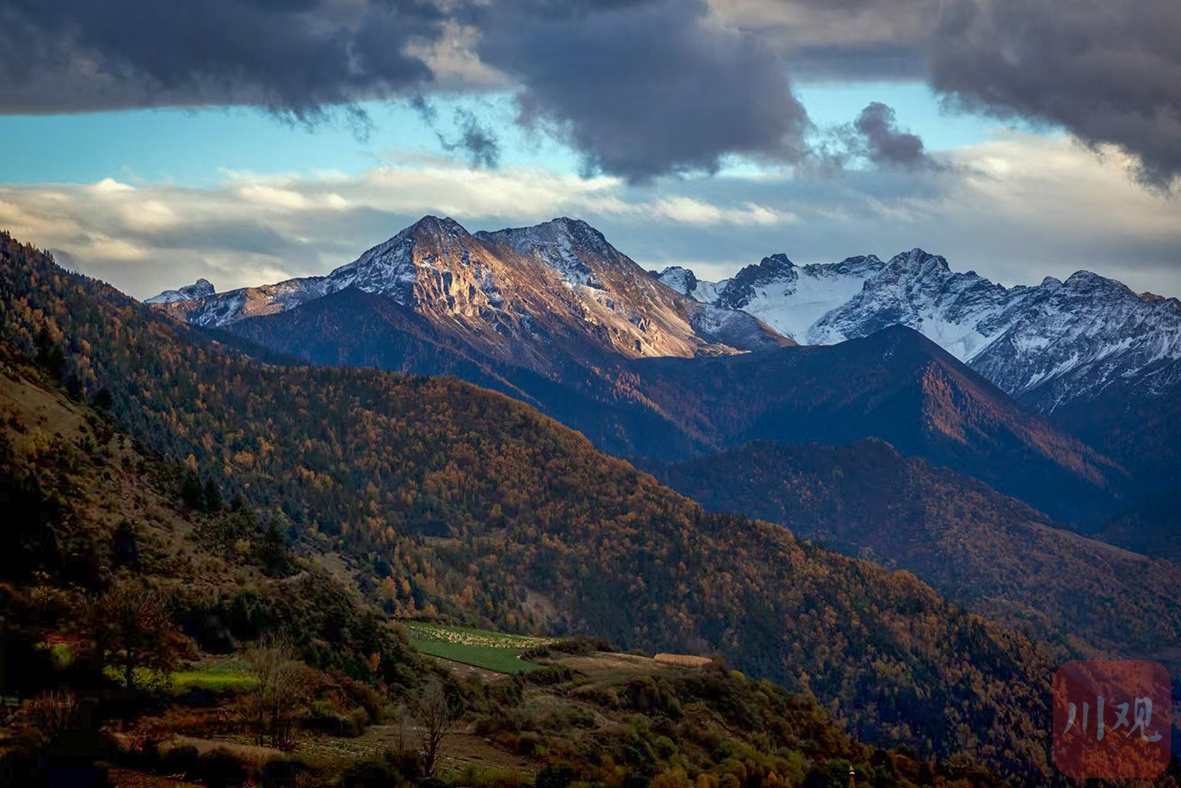 瑪嘉溝里,初冬仍有金秋余韻,金黃與火紅交織成樹木的盛裝。溪流潺潺,倒映著山色,樹葉如雪花飄落,鋪在小徑上,腳步踏上去沙沙作響,山陰處有初雪;行徑在夢筆山理小路,沿小路前行別具風(fēng)情,仿佛能穿越時空。初雪覆蓋的山巒在陽光下閃耀金光,與青稞田構(gòu)成一幅絕美的田園風(fēng)光。