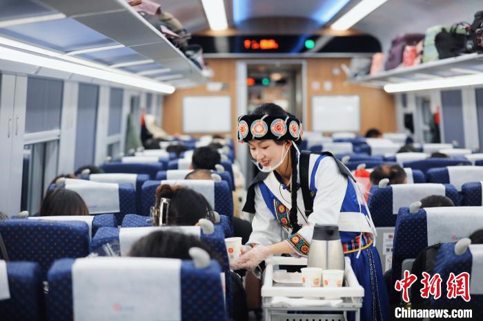 “歡迎大家嘗嘗我們列車上的酥油茶,正宗的咧?!憋w馳的列車上,格茸培楚身著藏族服飾,用藏語和普通話向乘客介紹著列車上充滿民族風(fēng)味的特色飲品和美食。
