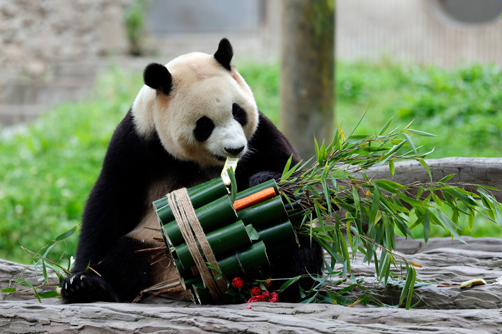 6月12日,大熊貓“福寶”在中國(guó)大熊貓保護(hù)研究中心臥龍神樹(shù)坪基地的圈舍進(jìn)食。新華社記者 沈伯韓 攝