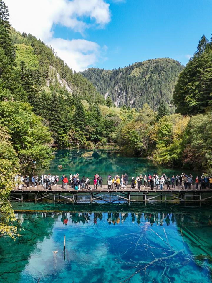 10月10日,游客在九寨溝景區(qū)五花海游覽觀(guān)光。新華社記者 王曦 攝