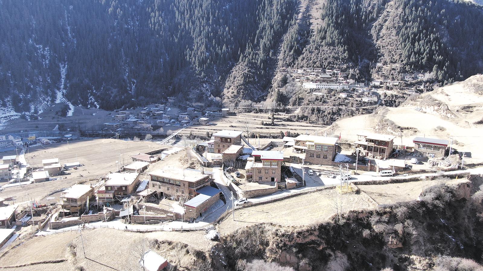1月13日,記者從班瑪縣出發(fā),沿著蜿蜒的瑪珂河一路南下,來(lái)到了“中國(guó)保存最完好的藏式碉樓群落之一”的班瑪縣燈塔鄉(xiāng)班前村。走進(jìn)班前村,只見(jiàn)四面群山環(huán)繞,不遠(yuǎn)處,結(jié)著冰的瑪珂河像一條白絲帶,在陽(yáng)光的照耀下格外耀眼。依山傍水的班前村地勢(shì)起伏較大,行走其間多半為上坡路,不一會(huì)兒,記者來(lái)到一處相對(duì)平坦的房屋前,上面掛著的匾額上赫然寫著“中國(guó)傳統(tǒng)村落——班前村”。