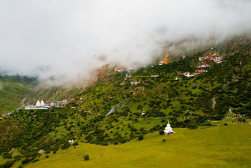 紅白相間的建筑群,牦?;蚬酚迫蛔缘玫嘏P著;偶爾有幾個(gè)僧人慢慢走過(guò),或論著經(jīng)書(shū),或拿水壺……世俗與修行,喧囂與寧?kù)o,在這里有著絕妙地平衡。