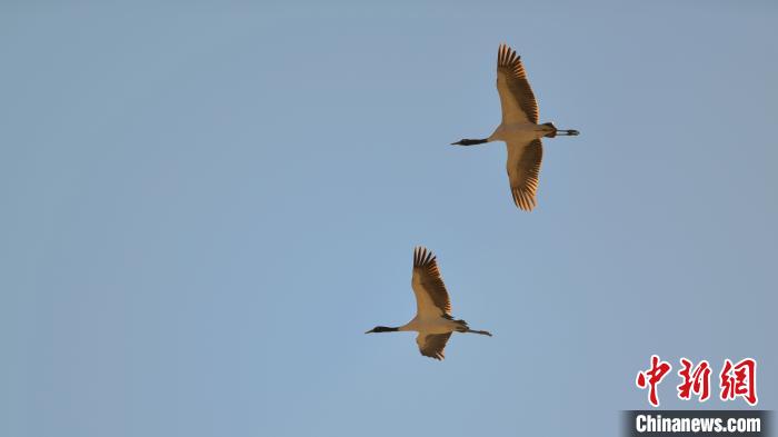 兩只黑頸鶴結(jié)伴翱翔,姿態(tài)優(yōu)美。 江飛波 攝