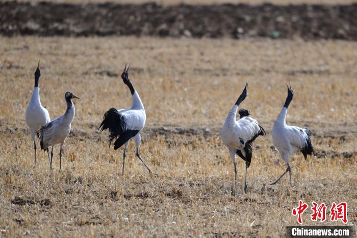 幾只黑頸鶴在收割后的青稞田間“高歌”。 江飛波 攝