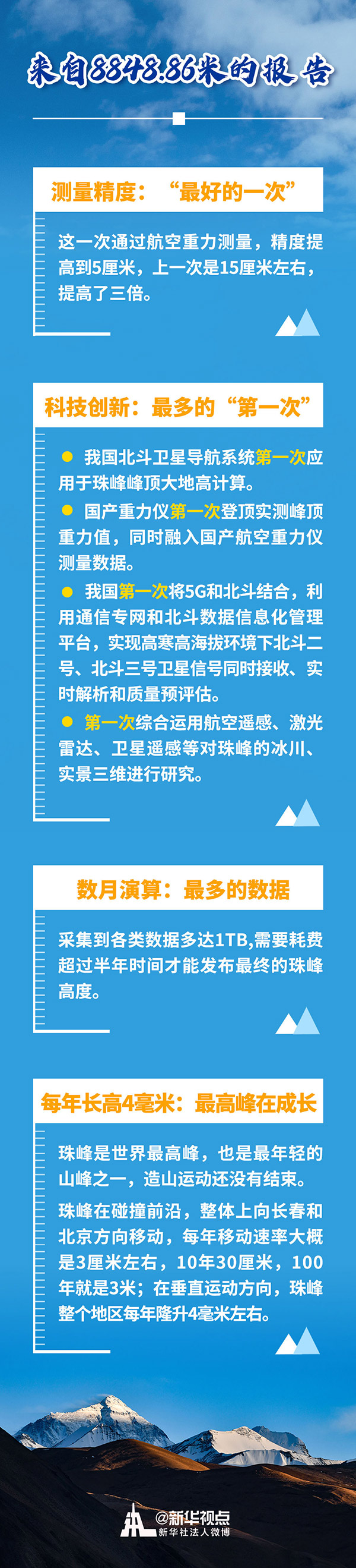8848.86米:作為世界最高峰的珠穆朗瑪峰最新“身高”8日公布。自然資源部權(quán)威人士說,同上一次測量結(jié)果相比,此次測量數(shù)據(jù)的科學(xué)性、可靠性、創(chuàng)新性,都達(dá)到一個新高度。