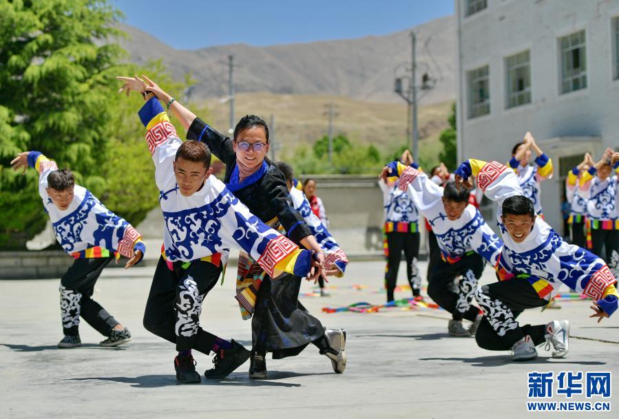 5月8日,在西藏山南市第一高級中學,來自湖北省武漢市旅游學校的援藏教師馬丹(左三)指導學生練習校園啦啦操。新華社記者 張汝鋒 攝