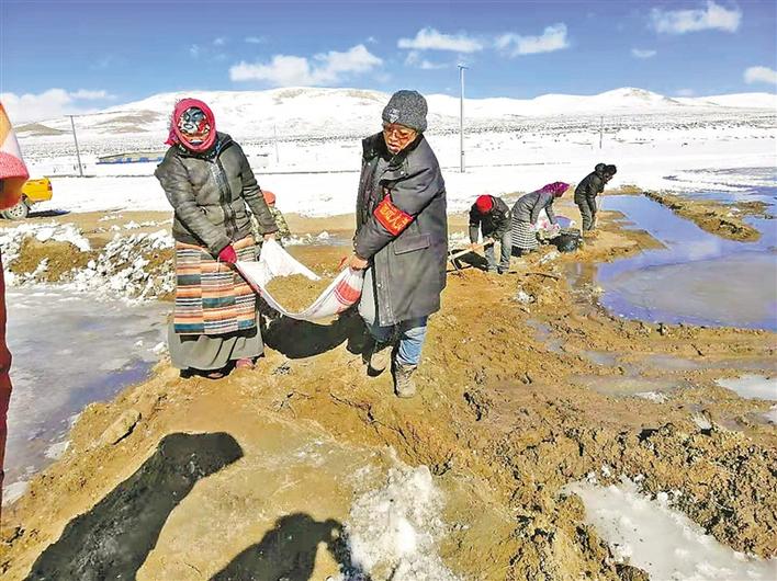 駐村期間,羅布頓珠(左二)同村民一起對嚴(yán)重影響農(nóng)牧民生產(chǎn)生活的滲水口進行了堵截。 中國電信西藏公司供圖