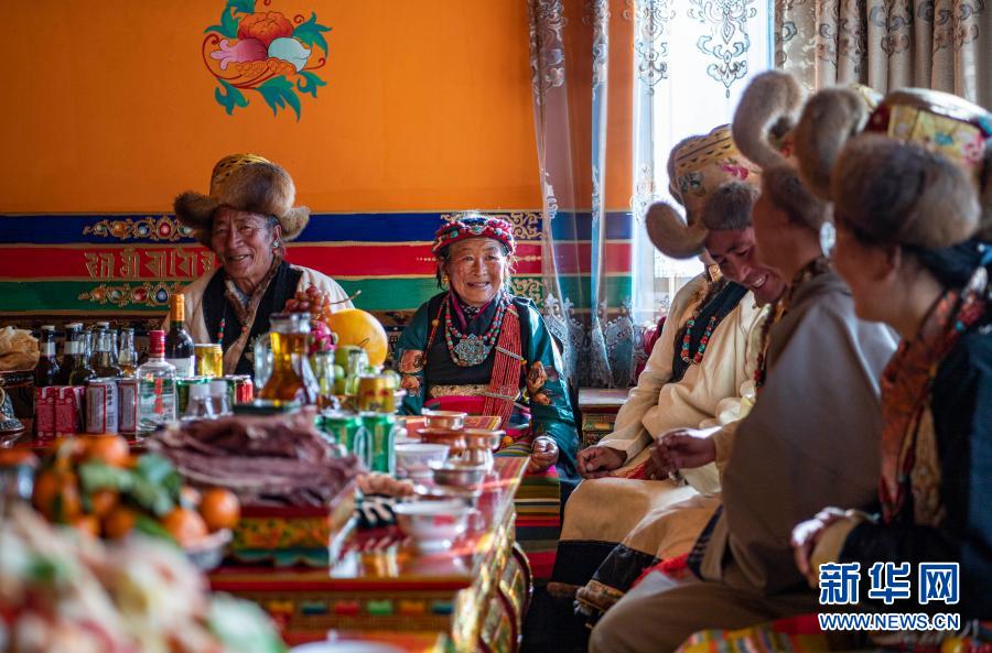 1月14日,在位于嘎吉林村安置點的新家中,村民們身著盛裝共度日喀則藏歷農(nóng)家新年。新華社記者 孫非 攝