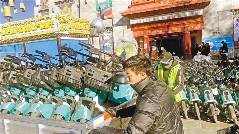 “?!瓪g迎使用共享電動車,請在運營區(qū)內(nèi)騎行,請慢點,注意安全。”共享電動車在拉薩市的落地投放,有利于緩解市民停車難、出行難壓力,助力城市智慧交通建設(shè)。在拉薩萬達廣場門口,工作人員正將共享電動車擺放整齊,并用酒精擦拭消毒。