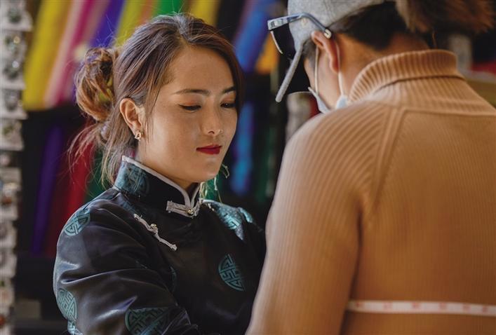 “老板,你家還有這款藏裝嗎?我想要一款?!痹谠摰陜?nèi),市民卓嘎拿出手機(jī),指著格桑措姆錄制的藏裝短視頻說道。“有的,這是我們今年推出的新款,是對(duì)傳統(tǒng)的藏裝進(jìn)行了改良,主要是體現(xiàn)在領(lǐng)口處,改良后的藏裝對(duì)領(lǐng)口部位進(jìn)行了復(fù)古簡約化設(shè)計(jì),使其兼具美觀性與舒適性,再搭配一個(gè)‘卡烏’堪稱完美。”格桑措姆介紹道。