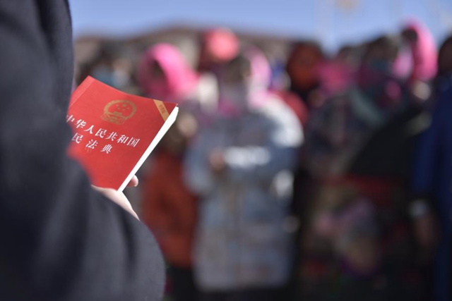 尼瑪縣人民法院法官拉姆曲珍手中的民法典(2021年2月2日攝)。新華社記者 格桑朗杰 攝