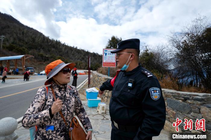 圖為警務(wù)室民警為游客講解景區(qū)內(nèi)的相關(guān)注意事項。江才云旦 攝