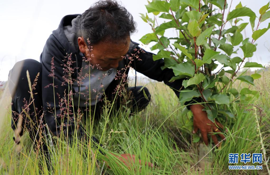 索朗羅布在檢查樹的長勢(shì)(2020年8月8日攝)。新華社記者 覺果 攝