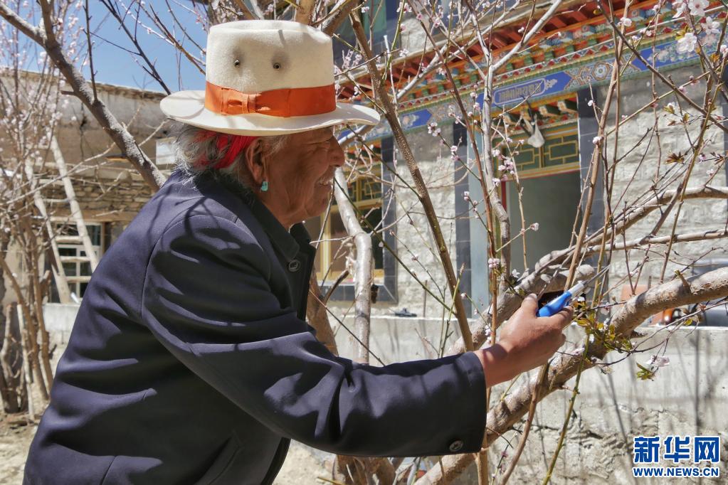 頓珠旺杰在修剪家里的桃樹樹枝(4月5日攝)。新華社記者 孫陽(yáng) 攝