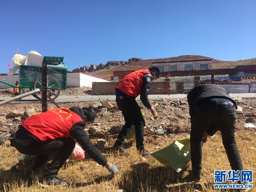 區(qū)黨校駐村工作隊(duì)組織在家牧民黨員在學(xué)校、廣場、村委會等場所集中清理生活垃圾和建筑垃圾(4月29日攝)。新華網(wǎng)發(fā) 王煦樟攝