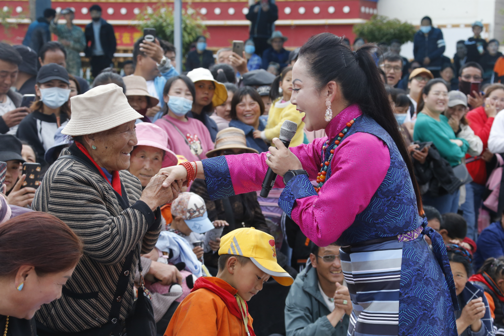 在下鄉(xiāng)途中,德西美朵不僅給群眾演唱,而且還積極向當?shù)乩习傩諏W習民歌。她說:“我希望可以通過我的演繹讓更多人聽到西藏群眾的聲音?!?/p>
