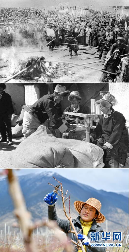 這是一張拼版照片:上圖為1959年8月,西藏墨竹工卡縣的翻身農(nóng)奴焚燒三大領(lǐng)主的剝削文契(新華社發(fā));中圖為1984年,江孜縣農(nóng)民洛桑旺堆(左)向國家出售余糧。他家承包土地100多畝,農(nóng)忙種地,農(nóng)閑搞建筑、跑運(yùn)輸(新華社記者土登攝);下圖為2020年3月22日,西藏林芝現(xiàn)代蘋果標(biāo)準(zhǔn)化示范園的工作人員為桃樹剪枝。該示范園實(shí)施農(nóng)機(jī)農(nóng)藝結(jié)合、水肥一體化及“果草畜循環(huán)”,大面積推廣蘋果矮砧集約高效栽培技術(shù),帶動米林縣羌納鄉(xiāng)林巴、才巴、色沃村及附近的農(nóng)戶增收(新華社記者 張汝鋒 攝)。新華社發(fā)