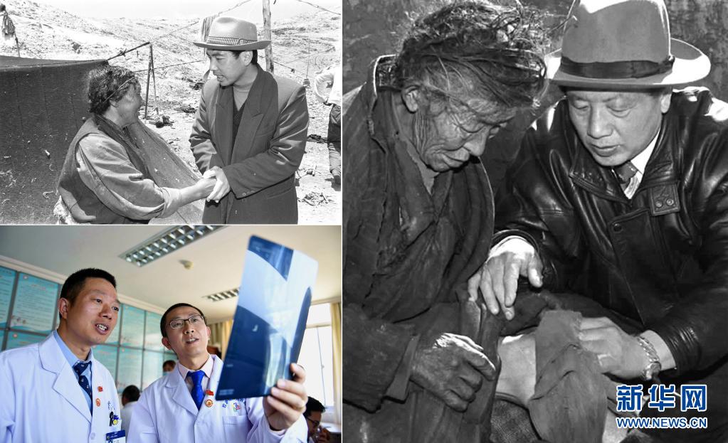 這是一張拼版照片:左上圖為來自陜西的援藏干部阿里日土縣副縣長賈冗勇深入牧區(qū),幫助藏族牧民解決生產(chǎn)、生活的實(shí)際困難(新華社記者土登攝 1997年11月11日發(fā));左下圖為2017年8月3日,北京積水潭醫(yī)院援藏醫(yī)生龔曉峰(右)和北京天壇醫(yī)院援藏醫(yī)生李家謀在拉薩市人民醫(yī)院骨科病房內(nèi)查看患者的X光片,進(jìn)行工作交接(新華社記者晉美多吉攝);右圖為孔繁森(右)在阿里日土縣過巴鄉(xiāng)為孤寡老人益西卓瑪治?。ㄐ氯A社記者土登攝 1994年12月26日發(fā))。新華社發(fā)