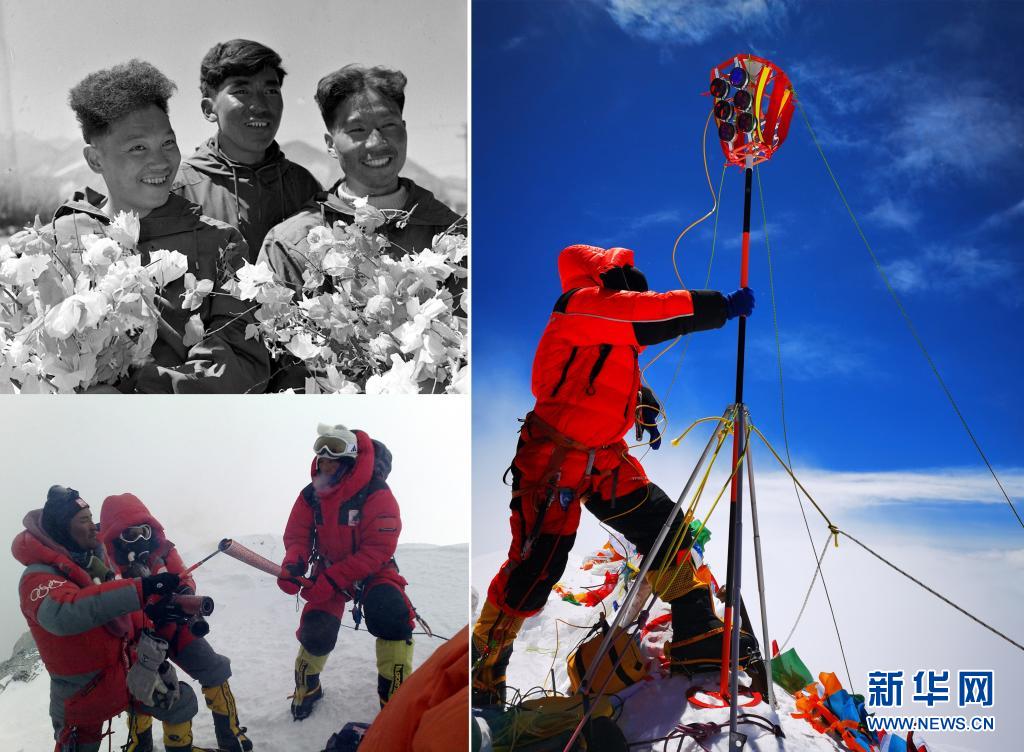 這是一張拼版照片:左上圖為1960年5月登上珠穆朗瑪峰頂?shù)闹袊巧疥?duì)隊(duì)員王富洲(右)、貢布(中)和屈銀華(資料照片 新華社發(fā));左下圖為2008年5月8日,北京奧運(yùn)圣火珠峰傳遞登山隊(duì)隊(duì)員羅布占堆(左)點(diǎn)燃第一棒火炬手吉吉手中的“祥云”火炬(新華社發(fā));右圖為2020珠峰高程測量登山隊(duì)隊(duì)員在珠穆朗瑪峰峰頂開展測量工作(2020年5月27日新華社特約記者扎西次仁攝)。新華社發(fā)