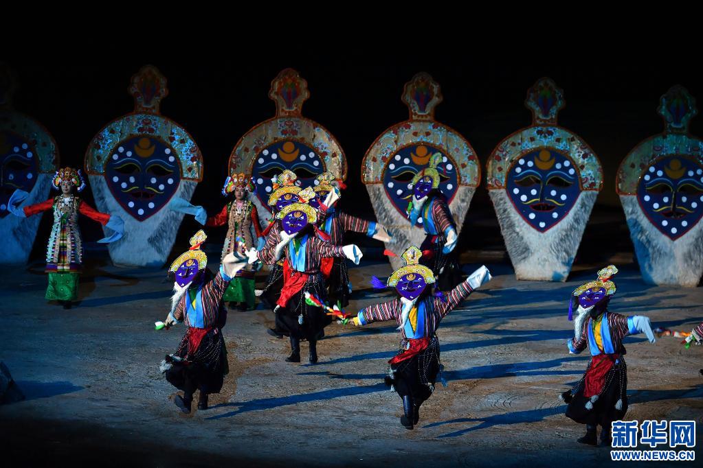 大型實景劇《文成公主》演職人員共計800余名,除專職演員外,很多當(dāng)?shù)夭刈遛r(nóng)牧民參與演出,有效促進(jìn)了當(dāng)?shù)厝罕娋蜆I(yè)增收。圖為演員在劇中表演藏戲(2019年10月31日攝)。新華社記者 李鑫 攝