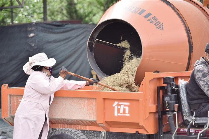 工作人員對(duì)種子進(jìn)行飛播前加工。