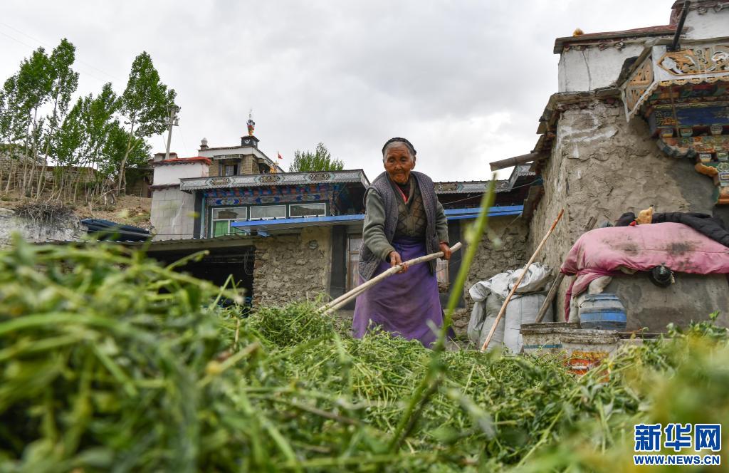 次仁央宗老人在曬牧草(6月3日攝)。新華社記者 晉美多吉 攝