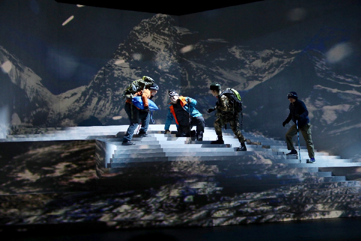 舞臺上,話劇《種子天堂》劇情進(jìn)入最高潮——在缺氧、強(qiáng)風(fēng)惡劣環(huán)境下,鐘揚(yáng)拼盡氣力來到海拔6000米的高度。當(dāng)他終于在一堆雜草和冰雪中發(fā)現(xiàn)那株頑強(qiáng)的雪蓮時(shí),就像父親看到自己剛出生的嬰兒,臉上掛著深深的喜悅,凝望良久……