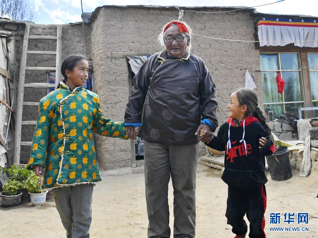 索朗老人拉著曾孫女的手,準備去散步(4月18日攝)。新華社記者 張汝鋒 攝