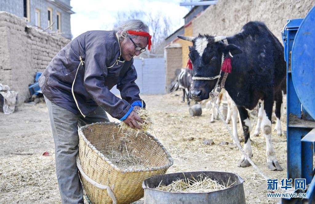 索朗老人為牛添加飼料(4月18日攝)。新華社記者 張汝鋒 攝