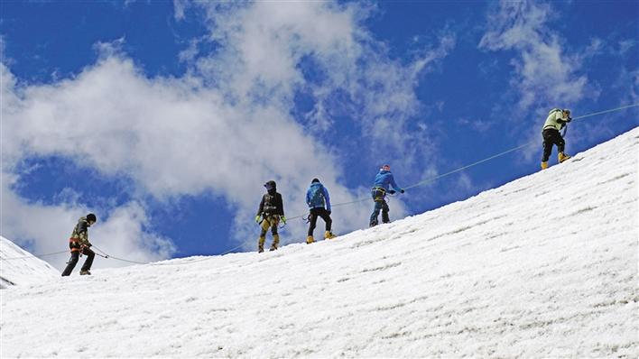 壓題圖片為洛堆峰登山探險(xiǎn)活動(dòng)中,登山愛(ài)好者在5400米雪線(xiàn)處進(jìn)行冰雪和登山技術(shù)訓(xùn)練。記者 鄭璐 張姝 攝