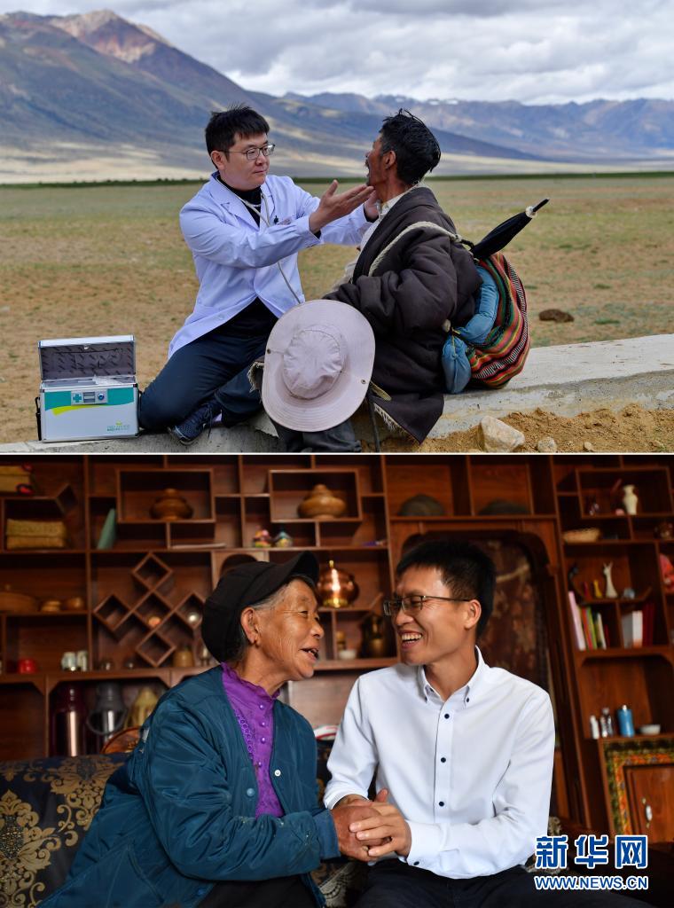 這是一張拼版照片:上圖為北京援藏醫(yī)生王克明(左)在西藏當(dāng)雄縣格達(dá)鄉(xiāng)格達(dá)村牧場為牧民義診(2021年6月19日攝,新華社記者張汝鋒攝);下圖為在西藏林芝市米林縣,廣東援藏干部黃南蔭(右)與珞巴族老阿媽亞加在一起(2021年6月19日攝,新華社記者覺果攝)。新華社發(fā)