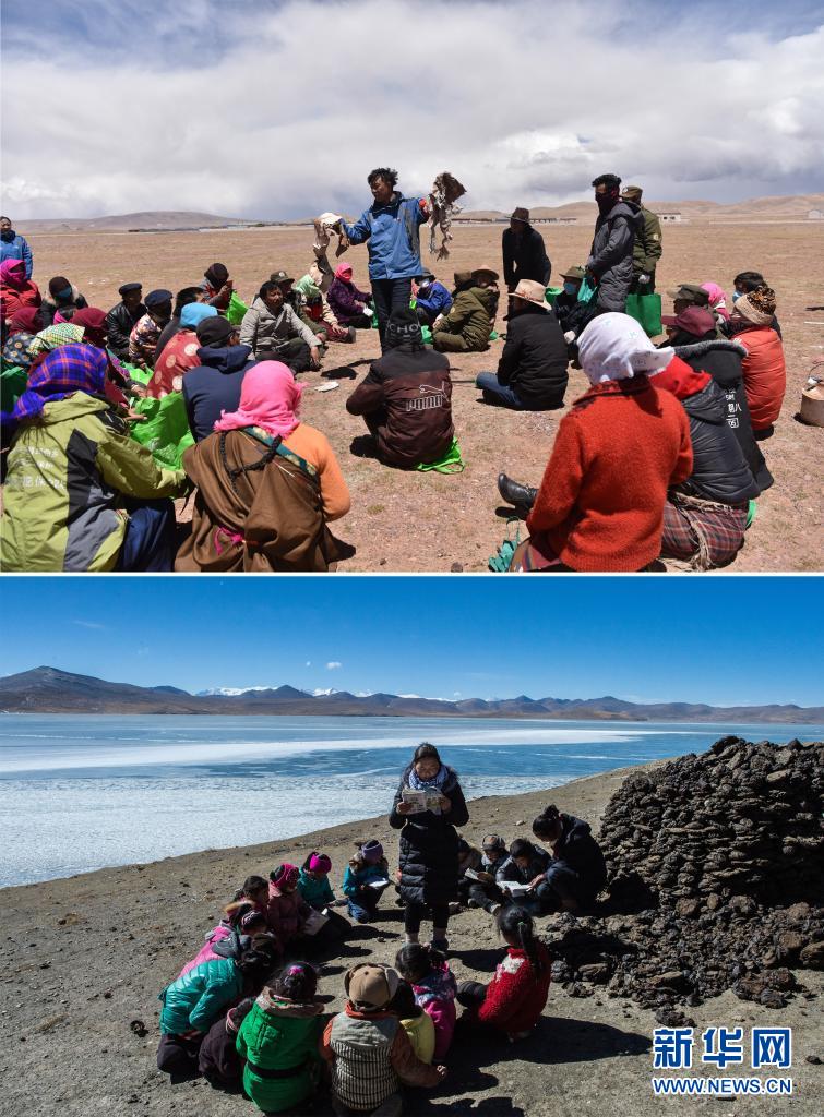 這是一張拼版照片:上圖為瑪曲鄉(xiāng)黨委書記朗卡江村(中)向參加活動的村民講解如何區(qū)分可回收垃圾與不可回收垃圾(2019年5月28日攝,新華社記者周錦帥攝);下圖為在海拔約5000米的西藏山南市浪卡子縣堆瓦村,駐村工作隊(duì)員貢曲(中)和次仁倉決(右一)給放假的孩子補(bǔ)習(xí)功課(2017年2月9日攝,新華社記者普布扎西攝)。新華社發(fā)