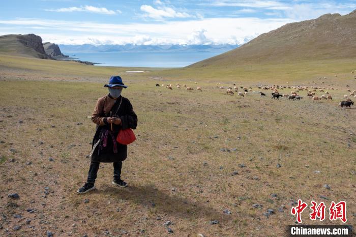 走出羊圈后,土桑趕著700多只羊往山坡上去,他一邊走著一邊將牦牛毛捻成細(xì)線。“湖邊風(fēng)景好,待會(huì)兒羊群就到山上去了,在那里可以俯瞰納木錯(cuò),也可以看見圣象天門?!蓖辽Uf,放牧的生活簡(jiǎn)單、充實(shí)。